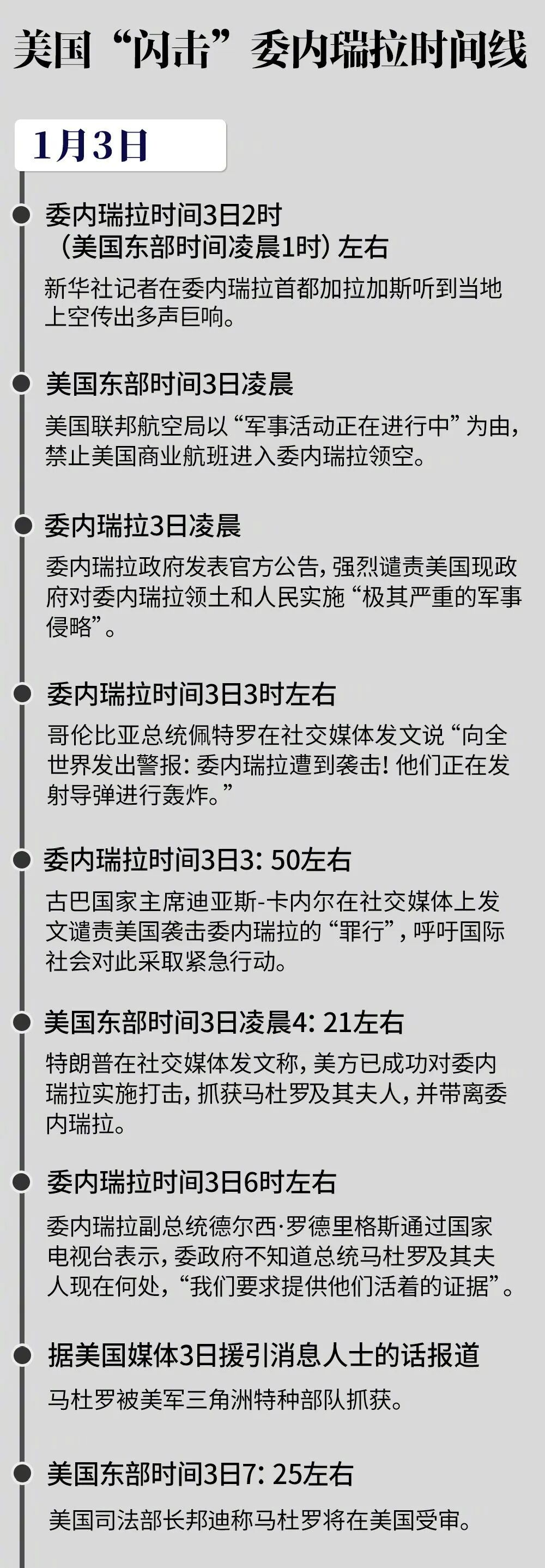 当地时间1月3日,美国总统特朗普称,美方已成功对委内瑞拉实施打击,抓获委内瑞拉总统马杜罗及其夫人,并带离委内瑞拉,此次行动是与美国执法部门联合进行的。当天稍早时,委内瑞拉首都加拉加斯传出爆炸声,随后响起防空警报。有目击者称,多起爆炸发生在加拉加斯南部的军事设施附近,据称相关地区已断电。
